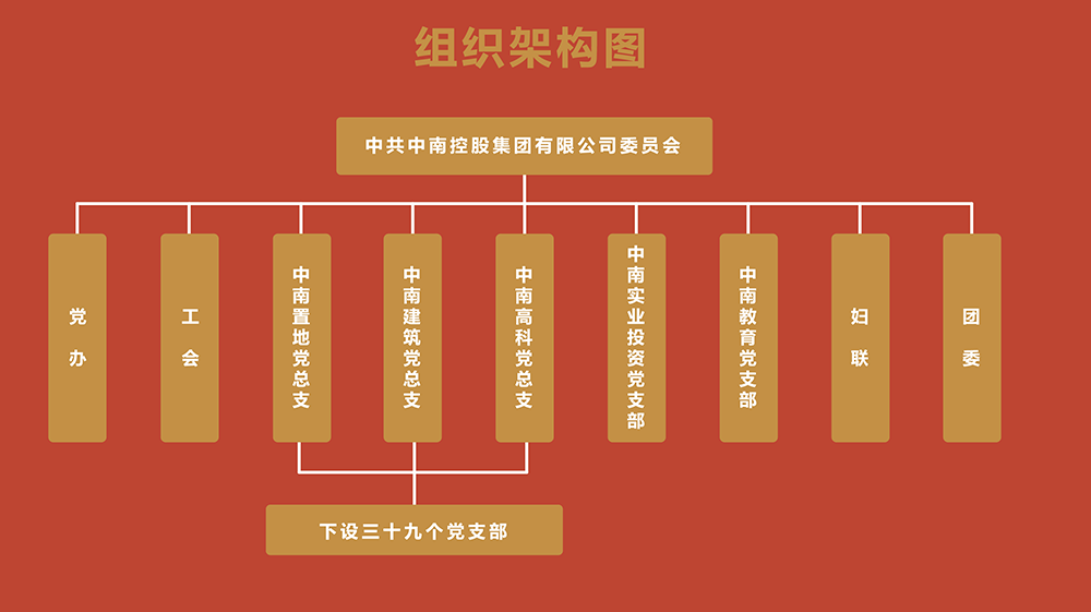 1988年,中共中南控股集團(tuán)有限公司黨支部成立,2002年升級(jí)為中共中南控股集團(tuán)有限公司黨總支,2007年6月,成立中共中南控股集團(tuán)有限公司委員會(huì)。目前公司黨委下設(shè)2個(gè)黨總支,39個(gè)黨支部,655名黨員。